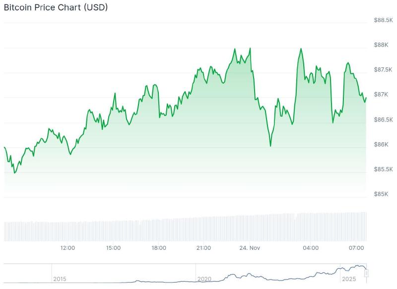 On Saturday, the Bitcoin price turned red again, but Sunday marked the best day since October 26. Bitcoin gained 2.48% and even touched $88,000.